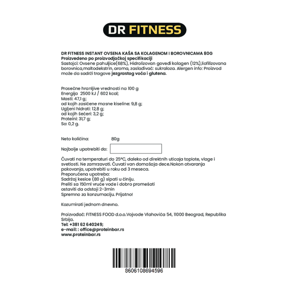 Zakoračite u dan sa energijom ili optimizujte oporavak uz našu Instant kolagen kašu! Ova inovativna mešavina kombinuje hranljive ovsene pahuljice sa kolagenom, ključnim sastojkom za zdravlje zglobova i kože, što je izuzetno važno u fitnesu. Dodatak osvežavajuće liofilizovane borovnice i nežne arome vanile stvara ukusan obrok bez dodatog šećera, savršen za brzu pripremu. Uživajte u obroku koji vas drži sitim, podržava oporavak i pruža esencijalne nutrijente za vaš aktivan životni stil.